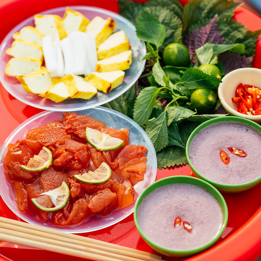 🥢赤クラゲは、マングローブの樹皮に漬けることで赤い色になり、コリコリとした食感とさっぱりとした味わいが特徴です。焼き豆腐やココナッツ、香草とともに、マムトム(発酵エビ味噌)につけて食べることで、より一層風味が引き立ちます。