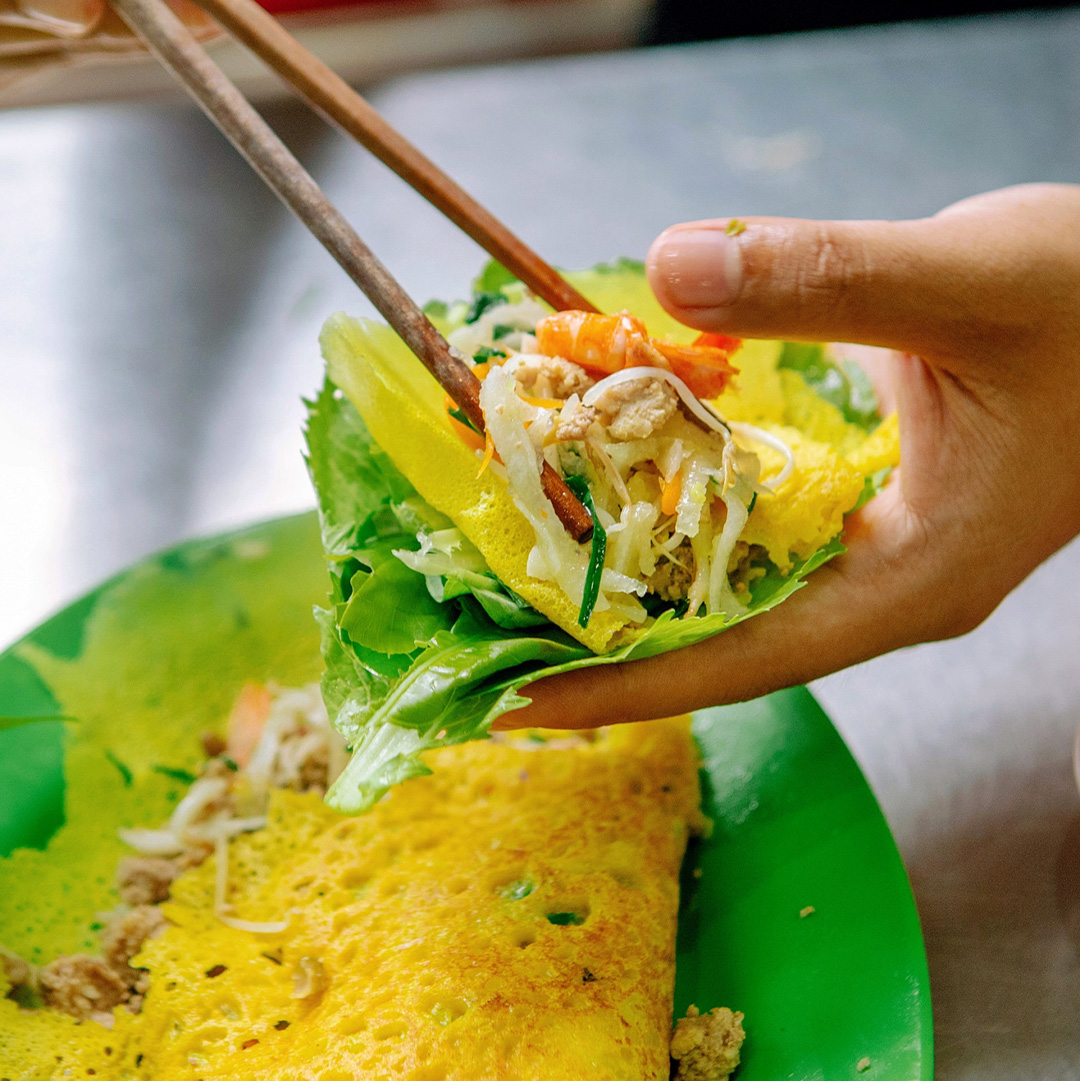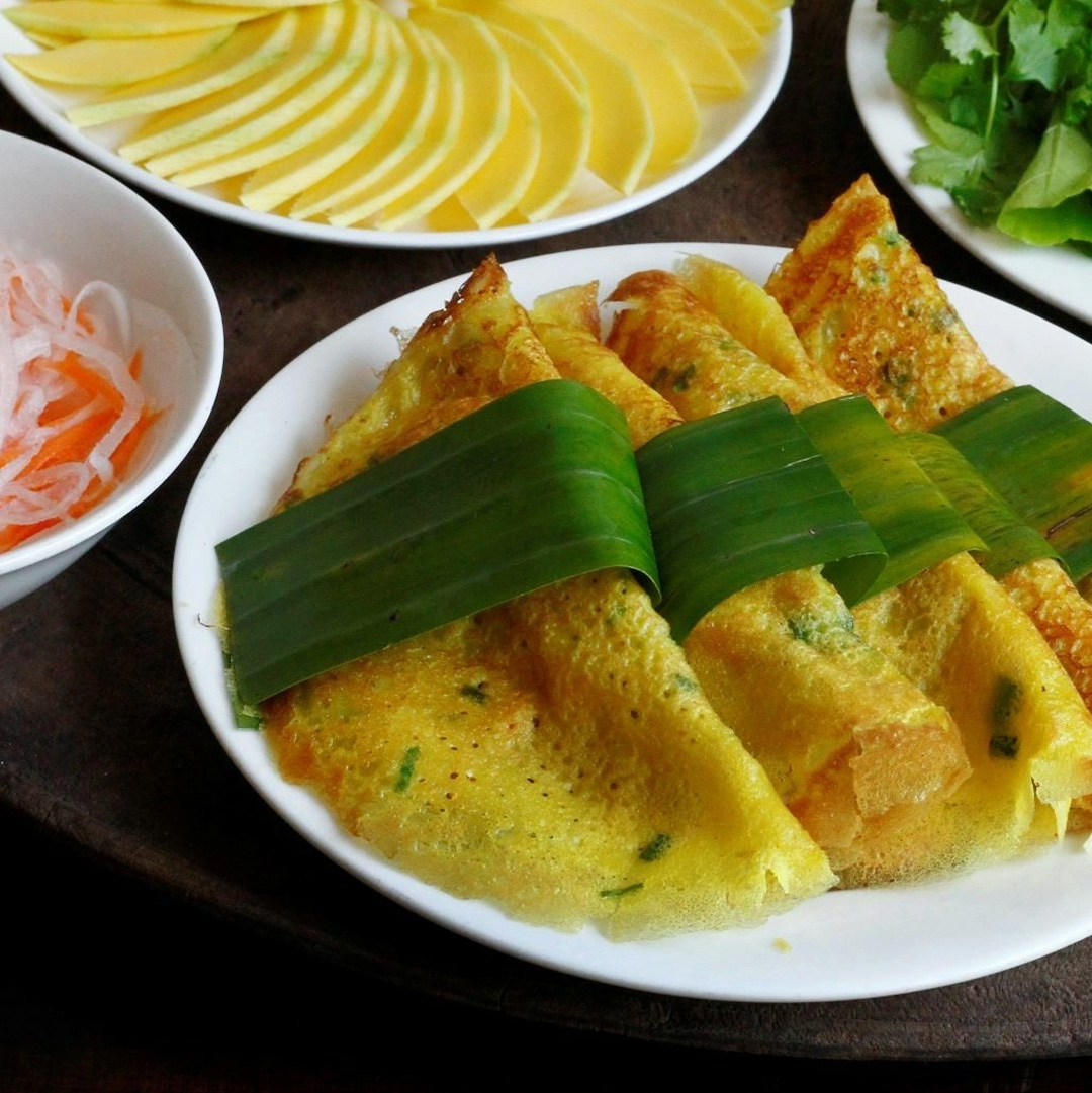 バインセオは、米粉で作った薄い生地をカリッと焼き上げた、ベトナム風のお好み焼きのような料理です。ターメリックを加えることで、鮮やかな黄色に仕上がるのが特徴です。