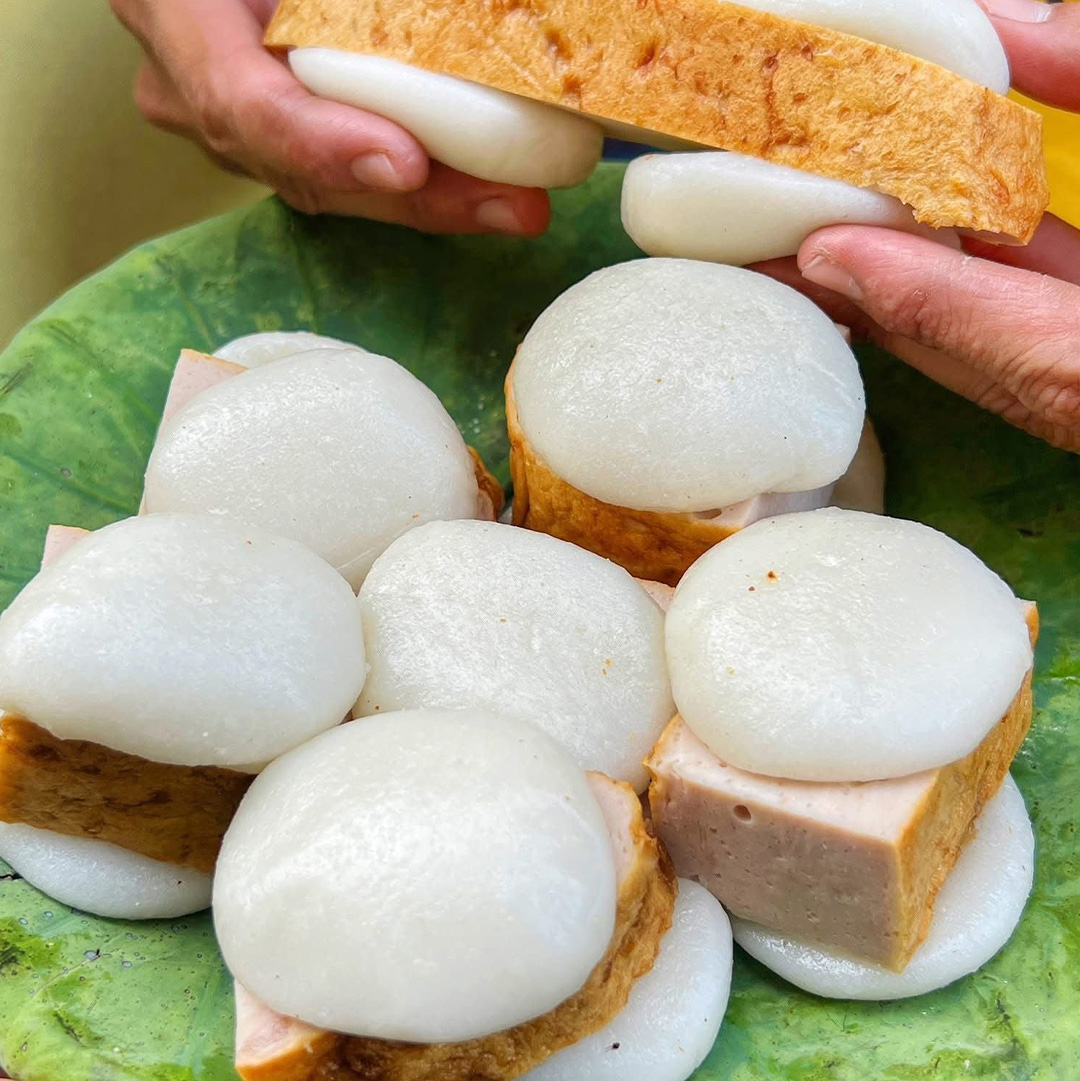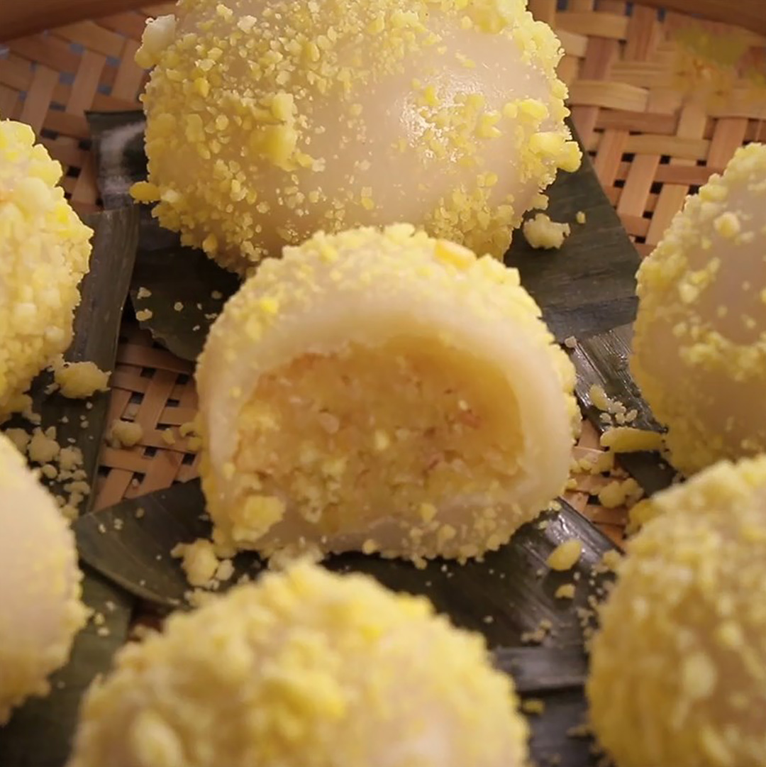 伝統的には緑豆あんが入ることが多いですが、ココナッツを加えた甘いタイプや、具が入っていないものもあり、ベトナム風ソーセージ(チャー)などを挟んで食べることもあります。